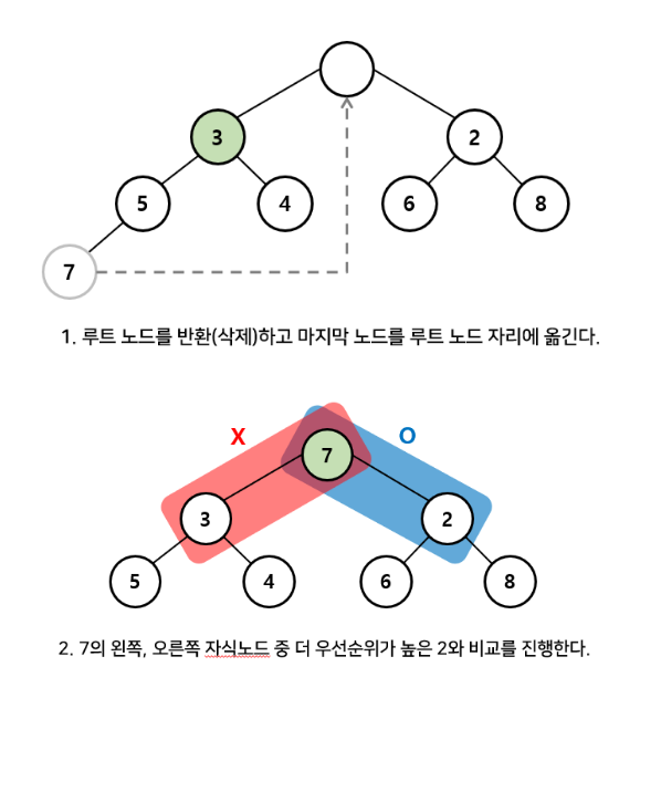 - 위치를 만족할 때까지 자식 노드와 위치를 변경하며 올바른 위치까지 이동