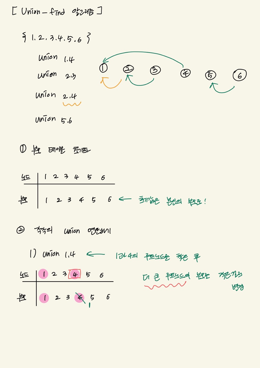 - 서로소 집합 자료구조는 union + find 연산으로 구성되어 union-find 자료구조라 불린다.