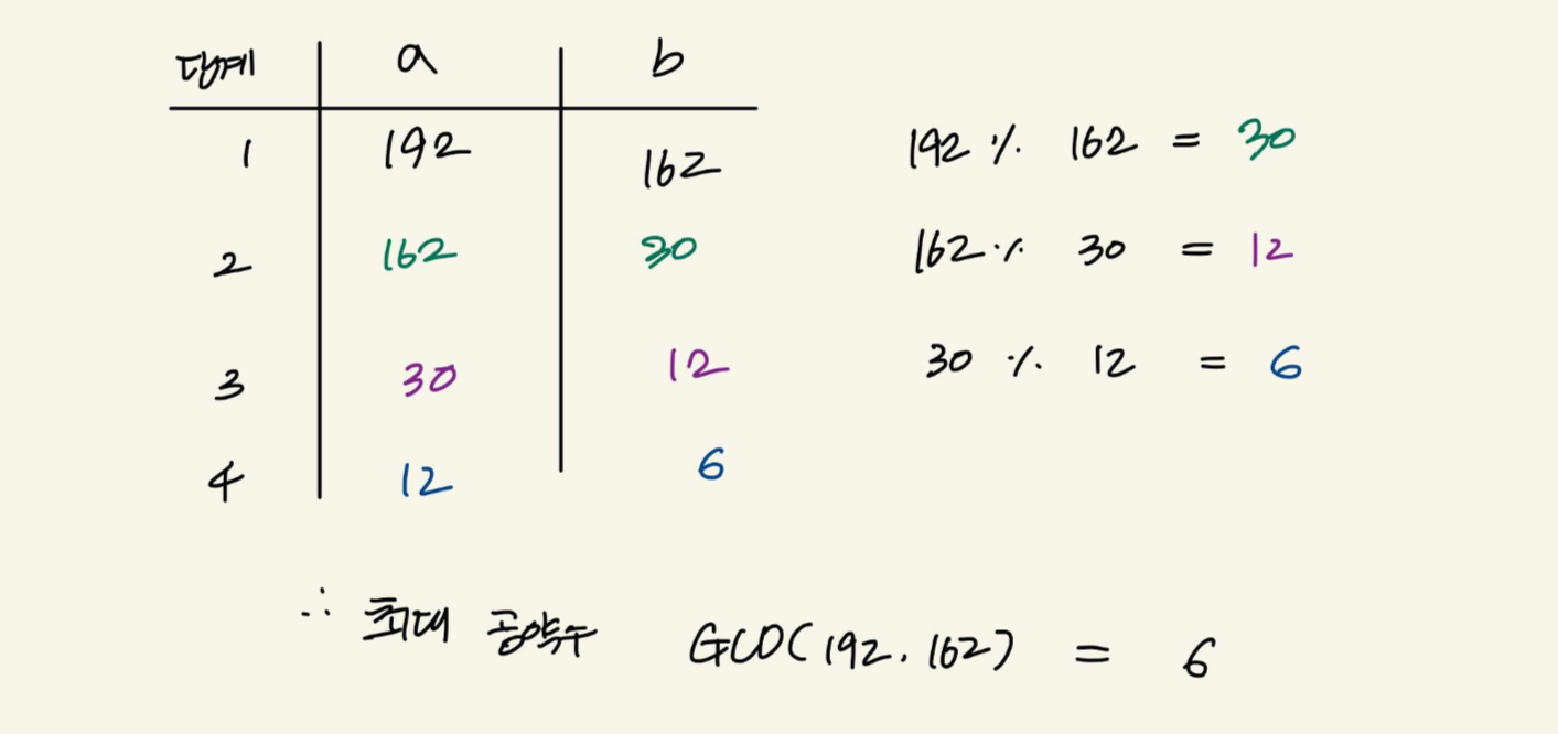 - 두 개의 자연수에 대한 최대공약수를 구하는 유클리드 호제법 알고리즘 이용한다.