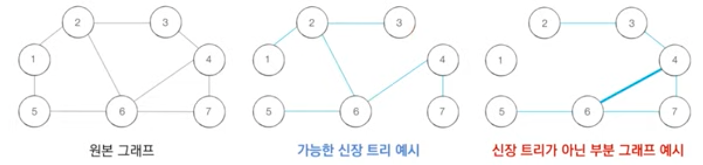 - 그래프에서 모든 노드를 포함하면서 사이클이 존재하지 않는 부분 그래프를 의미한다.