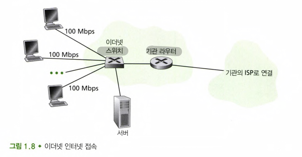 - 이더넷 접속에서 사용자들은 보통 이더넷 스위치에 100 Mbps 혹은 1 Gbps로 접속하고, 서버는 1 Gbps 혹은 10 Gbps로 접속한다.
