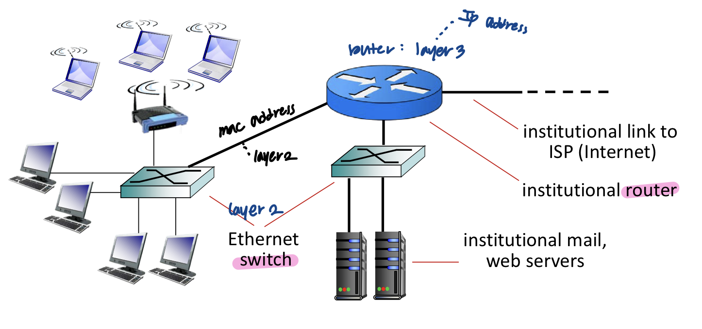 - 이더넷 스위치 혹은 상호연결 된 스위치들의 네트워크는 이제 다시 더 큰 인터넷으로 연결된다.