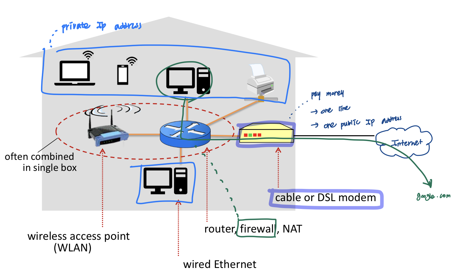 - 아래 그림과 같이 홈네트워크는 유선 PC뿐 만 아니라 로밍랩톱, 무선 PC와 가정 내의 다른 무선 장치들과 통신하는 기지국(base station)(무선 AP), 광대역 인터넷 접속을 제공하는 케이블 모뎀, 그리고 기지국과 케이블 모뎀을 가진 고정 PC를 연결하는 라우터 등 으로 구성된다.